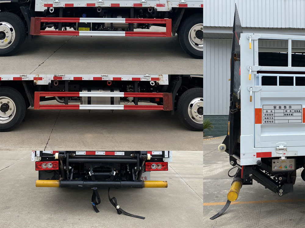 其它:1、该车适用于运输危险品。类项号:2.1,2.2。该车用于运输具有独立容器(瓶)包装的物品。2、侧,后防护材料均为Q235,螺栓连接,后防护截面尺寸φ100mm,下边缘离地高430mm;选装后部无尾板时,后防护材料为Q235,焊接,截面尺寸(mm):100×50,下边缘离地高430mm。选装栏板样式,选装尾板。尾板收起状态水平长度为280mm,尾板质量为350kg。3、整备质量含备胎,灭火器及随车工具;货厢重量为570kg;材质/厚度:底板Q235/3mm;侧墙板Q235/1.5mm;后墙板Q235/1.0mm。4、仅选用排气管前置、限速装置(限速80km/h)、前轮盘式制动及子午线轮胎的底盘,转向轮安装轮胎爆胎应急防护装置,安装具有卫星定位功能的行驶记录仪,仅选用3360mm轴距,选装ETC。ABS系统控制器型号/生产企业: :YF8/武汉元丰汽车电控系统有限公司,ABS-E/威伯科汽车控制系统(中国)有限公司,ABS-VI•E/广州瑞立科密汽车电子股份有限公司,YF9/武汉元丰汽车电控系统有限公司。发动机/油耗值(L/100km)对应关系为: D20TCIF2/11.22,D25TCIF1/11.16, D20TCIF1/11.22。
