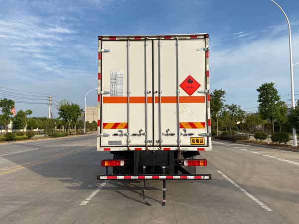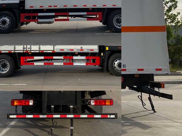 其它 | ABS型号:ABS-E,ABS/ASR-24V-4S/4M,CM4XL-4S/4M,3550D-1010;ABS生产企业:威伯科汽车控制系统(中国)有限公司,东科克诺尔商用车制动系统(十堰)有限公司,广州瑞立科密汽车电子股份有限公司,东科克诺尔商用车制动系统(十堰)有限公司;安装有限速装置;限速装置限速(km/h):80;安装有具有卫星定位功能的行驶记录仪;选装描述:选装侧门型式及位置,选装侧门数量,选装不开侧门,厢体侧面板选装开百叶窗,选装瓦楞板结构.该车型可选装ETC车载装置;发动机/油耗值(L/100km)对应关系为:F4.5NS6B220/24.4,B6.2NS6B210/26;侧后防护情况:侧、后防护材料均为Q235,螺栓连接,后防护截面尺寸120×70mm,下边缘离地高450mm;车厢顶部封闭且不可开启;运输独立容器(瓶)包装的货物;危险货物类项号:第3类;其他说明:仅选用排气管前置、前轮盘式制动及子午线轮胎的底盘.该车转向轮安装轮胎爆胎应急防护装置,后轴采用空气悬架.该车为危险货物运输车。选装后尾板时,后防护材料为Q235,焊接,截面尺寸120×50mm,下边缘离地高450mm。尾板收起状态水平长度为290mm,尾板质量为550kg。随底盘选装驾驶室;选装燃油箱,电瓶,尿素罐,后处理,储气筒左右安装位置。 | ||