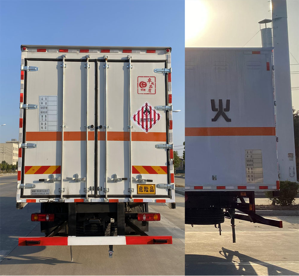 | 配置 | 1、该车适用于运输危险品,运输具有**容器(瓶)包装的物品,运送危险物品类项号:4.1,4.2,4.3。厢体顶部封闭,不可开启。2、侧/后防护材料为Q235,螺栓连接,截面尺寸(mm)120×60,下边缘离地高490mm。选装不带尾板。后防护材料为Q235,焊接,截面尺寸(mm)120×60,下边缘离地高490mm。3、仅采用轴距(mm):4700,5000。随底盘选装驾驶室前面罩,选装侧窗玻璃,驾驶室顶部中间三个装饰灯为选装件,前雾灯为选装件;驾驶室前脸扰流罩为选装件。仅选用排气管前置、限速装置(限速80km/h)、前轮盘式制动及子午线轮胎的底盘。转向轮安装轮胎爆胎应急防护装置。后轴采用空气悬架。安装带有卫星定位功能的行驶记录仪;EBS型号/生产厂家:EBS5/东科克诺尔商用车制动系统(十堰)有限公司。采用的发动机与油耗值(L/100Km)对应关系为: B6.2NS6B210/26.5,DDi50E190-60/23.9。厢体尾部安装尾板,尾板收起状态水平长度为290mm,尾板质量为550kg。选装ETC。 | ||