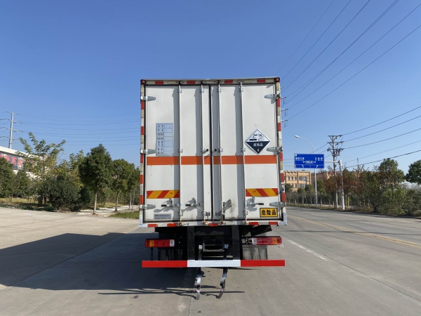 | 备注 | 该车为危险品运输车,随底盘选装驾驶室,选装后视镜,选装侧开门型式及位置,选装不开侧门,选装不同箱体外观,选装后部样式,选装后部尾灯架样式,安装限速装置,限速80km/h,车厢顶部封闭且不可开启;运输独立容器(瓶)包装的货物; | ||||||||||
