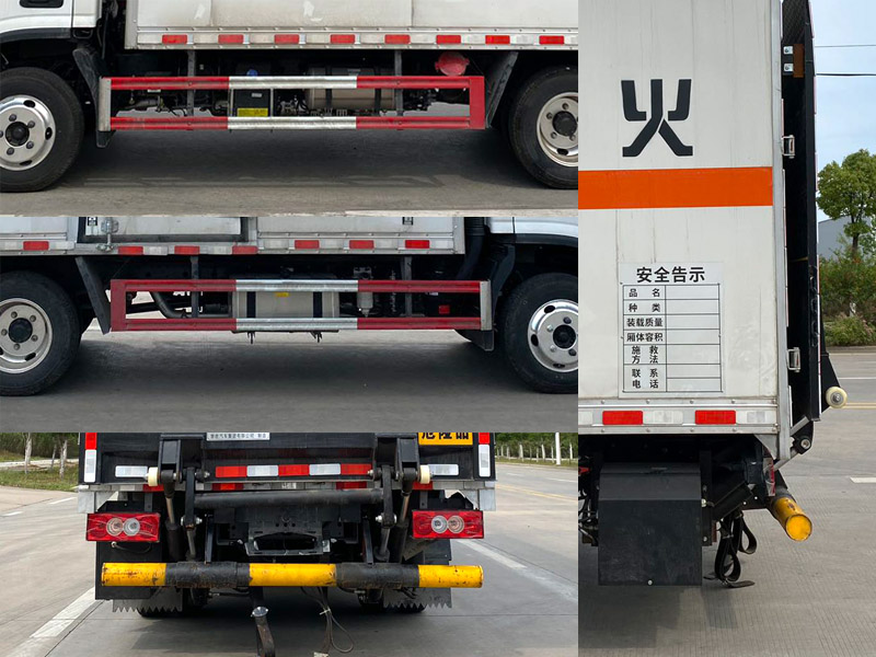 其它:1、该车为危险品运输车,运输具有独立容器(瓶)包装的物品,运送危险物品类项号:9。厢体顶部封闭,不可开启。2、侧、后防护材料均为Q235,螺栓连接,后防护截面尺寸(mm)Φ100,下边缘离地高390mm。选装后部无尾板时,后防护材料为Q235,螺栓连接,截面尺寸(mm)120×60,下边缘离地高400mm。尾板收起状态水平长度为280mm,尾板质量为350kg。3、整备质量含备胎,灭火器及随车工具;货厢重量为1050kg;材质/厚度:复合板结构厢体:底板材质为Q235,厚度4mm,侧板为外Q235+中间阻燃泡沫+内纯铝板,厚度42mm;瓦楞板结构厢体:底板材质为Q235,厚度4mm,侧板为Q235,厚度1.5mm。4、仅选用排气管前置、限速装置(限速80km/h)、前轮盘式制动及子午线轮胎的底盘,转向轮安装轮胎爆胎应急防护装置。安装带有卫星定位功能的行驶记录仪。ABS系统控制器型号/生产企业: :YF8/武汉元丰汽车电控系统有限公司,ABS-E/威伯科汽车控制系统(中国)有限公司,ABS-VI·E/广州瑞立科密汽车电子股份有限公司,YF9/武汉元丰汽车电控系统有限公司。发动机/油耗值(L/100km)对应关系为: D20TCIF2/11.22,D25TCIF1/11.16, D20TCIF1/11.22。仅选用3360mm轴距,选装ETC。厢体侧面选装开门型式及位置,选装不带侧开门,选装瓦楞板结构;厢体前后及侧面选装开百叶窗,选装后尾板样式,选装无后尾板。