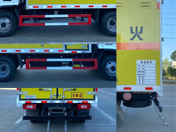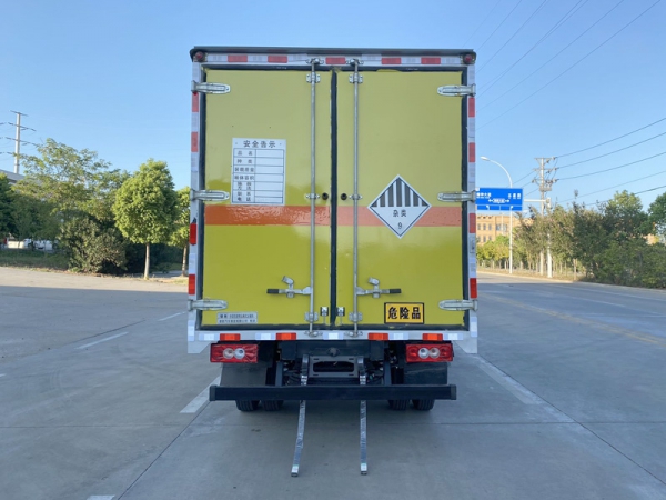 其它 | 1、该车为危险品运输车,运输具有独立容器(瓶)包装的物品,运送危险物品类项号:9.厢体顶部封闭,不可开启.2、侧、后防护材料均为Q235,螺栓连接,后防护截面尺寸(mm)100×50,下边缘离地高460mm.3、整备质量含备胎,灭火器及随车工具;货厢重量为1140kg;材质/厚度:复合板结构厢体:底板材质为Q235,厚度3mm,侧板为外Q235+中间阻燃泡沫+内纯铝板,厚度42mm;瓦楞板结构厢体:底板材质为Q235,厚度3mm,侧板为Q235,厚度1.5mm.4、仅选用排气管前置、限速装置(限速80km/h)、前轮盘式制动及子午线轮胎的底盘,转向轮安装轮胎爆胎应急防护装置。安装带有卫星定位功能的行驶记录仪。ABS系统控制器型号/生产企业: :ABS-VI.E/广州瑞立科密汽车电子股份有限公司,ABS-E/威伯科汽车控制系统(中国)有限公司.发动机/油耗值(L/100km)对应关系为:D25TCIF1/11.16,F2.5NS6B131/11.27,Q25-152E60/11.02.该车可选装直接供电式ETC车载装置.厢体侧面选装开门型式及位置,选装不带侧开门,选装瓦楞板结构;厢体前后及侧面选装开百叶窗,选装后部样式.随底盘选装电瓶、储气筒安装位置,选装尿素罐样式.选装驾驶室. | ||