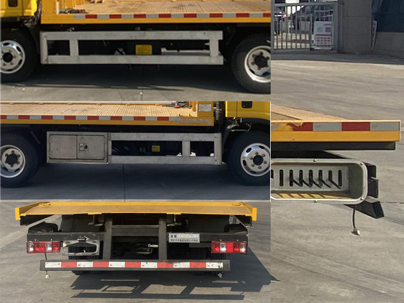 其它:该车主要用于道路清障,主要专用装置为平板、绞盘、钢丝绳、油缸。该车无托举功能。侧防护材料为铝合金,螺栓连接;后防护材料为Q235,焊接,截面尺寸100×50mm,离地高度460mm。ABS型号/厂家:VIE ABS-II/浙江万安科技股份有限公司。