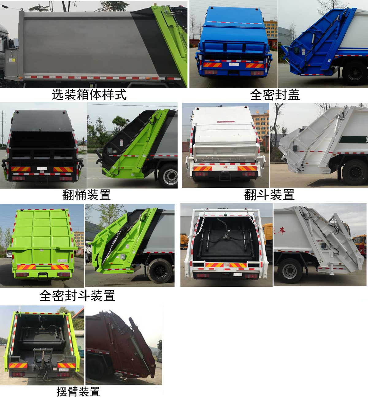 | 配置 | ABS系统**器生产企业/型号为威伯科(上海)管理有限公司/4460046300;选装EBS,EBS系统**器生产企业/型号为威伯科(上海)管理有限公司/EBS3。该车型可选装ETC车载装置。该车可选装方形或弧形箱体,选装全密封盖装置,选装爬梯。选装后部工作装置整车长度/轴距/后伸对应关系为(mm):①无翻转机构时8730/4500/-,8930/4700/-。②翻桶装置、半密封装置9130/4500/400,9330/4700/400。 ③全密封斗装置、摆臂装置8930/4500/200,9130/4700/200。随底盘选装驾驶室。发动机/油耗值(L/100km)对应关系为:WP4.6NQ220E61/24.97; WP6H245E61/25.5.侧防护采用Q235,螺栓连接;后防护由专用装置替代,下边缘离地高:500mm;专用功能及装置:该车主要专用装置由箱体、压缩系统组成,用于垃圾的收集与清运;仅选用轴距4500mm,4700mm.选装前部、后部组合灯具。选装电瓶箱、储气筒、尿素罐的外观型式和布置位置,选装污水箱位置。 | ||