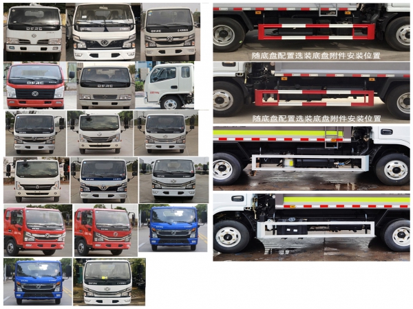 其它 | 该车主要专用装置由箱体、压缩系统组成,用于垃圾的收集与清运.侧防护材料为冷弯型钢/Q235,螺栓连接;后防护由专用装置代替,下边缘离地高450mm.选装方形或弧形车箱;选装箱体与驾驶室之间多路阀、液压油箱、液压管布置;选装箱体前端爬梯位置;选装电瓶位置;选装多路阀罩;选装填装器外罩;选装后密封盖装置.选装不同工作装置时外形长/后伸(mm)对应关系:①无上料装置:6500/0,②摆臂装置:6650/150,③全密封斗装置:6650/150, ④半密封斗装置及⑤翻桶装置:6900/400.发动机与油耗值(L/100km)的对应关系为:CA4DB1-11E6/16.3,CY4BK161/16.2,CY4BK461/16.2,D20TCIF1/16.3,D20TCIF11/16.3,YCY24140-60/16.3,ZD30D16-6N/16.3,H20-120E60/14.9,Q28-130E60/15.9,CA4DB1-13E6/16.2,Q23-115E60/14.5.随底盘选装前面罩,前保险杠,前组合灯具,选装排半驾驶室,选装左右油箱位置,随底盘配置选装底盘附件安装位置.仅选用轴距3308mm底盘改装.选装直接供电式ETC车载装置.ABS型号/生产企业:ABS/ASR-12V-4S/4M/襄阳东风隆诚机械有限责任公司.各发动机净功率(kW)值如下:D20TCIF1:88,YCY24140-60:99,CA4DB1-11E6:79,ZD30D16-6N:115,CY4BK461:92,CY4BK161:102,Q23-115E60:82,H20-120E60:87,CA4DB1-13E6:93.Q28-130E60:93,D20TCIF11:88.随底盘选装气坛子、尿素罐安装位置.选装电瓶安装位置,选装污水箱安装位置.选装填充器样式.选装后部工作装置. | ||