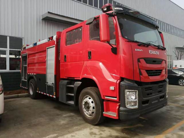 7吨消防车采用庆铃汽车股份有限公司QL1180EQFRY 型二类汽车底盘,改制双排驾驶室,乘员2+3人,该车驾乘舒适轻便。上装采用内藏式水罐,整车载液量水为4650kg,泡沫为1950kg。器材箱采用高质量铝合金卷帘门。底盘取力,发动机型号为6HK1-TCG61,最大功率177kW,通过万向联轴器驱动安装在汽车尾部泵房里的上海雄真CB10/60型常压消防泵,可在1.0MPa下稳定输出60L/s的流量;车顶安装成都威斯特消防器材有限责任公司生产的PL8/48型消防炮(泡沫消防车),流量48L/s,对应压力0.8MPa,最大承压1.3MPa,射程 水≥70m 泡沫≥60m,可360°旋转。同时该车具有比功率大、综合性能强、操控集中简便等特点。