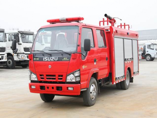 2吨消防车采用庆铃汽车股份有限公司QL1070BUHWY 型二类汽车底盘,原装双排驾驶室,乘员2+3人,该车驾乘舒适轻便。上装采用内藏式水罐,整车载液量为1880kg。器材箱采用高质量铝合金卷帘门。底盘取力,发动机型号为4KH1CN6LB,最大功率88kW,通过万向联轴器驱动安装在汽车尾部泵房里的CB10/30型常压消防泵,可在1.0MPa下稳定输出30L/s的流量;车顶安装PS8/30W型消防炮,流量30L/s,对应压力0.8MPa,最大承压1.3MPa,射程60m,可360°旋转。该车具有轴距短、通过性强、综合性能强、操控集中简便等特点。