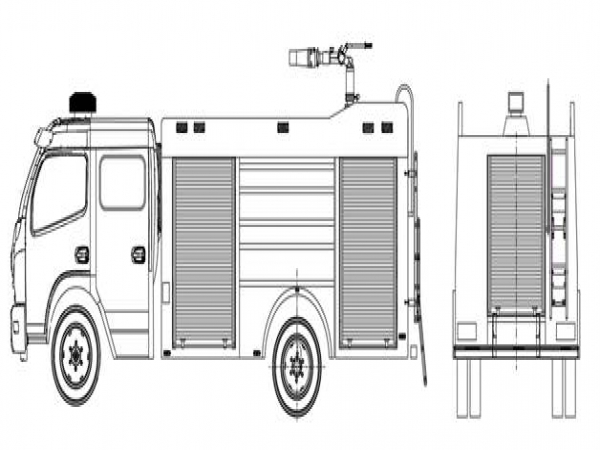 5吨消防车采用东风汽车股份有限公司EQ1125SJ8CDC 型二类汽车底盘,改制双排驾驶室,乘员3+3人,该车驾乘舒适轻便。上装采用外露式水罐,整车载液量为5000kg。器材箱采用高质量铝合金卷帘门。底盘取力,发动机型号为YCY30165-60,最大功率121kW,通过万向联轴器驱动安装在汽车尾部泵房里的上海雄真CB10/30型常压消防泵,可在1.0MPa下稳定输出30L/s的流量;车顶安装成都威斯特消防器材有限责任公司生产的PS8/30W型消防炮(水罐消防车),流量30L/s,对应压力0.8MPa,最大承压1.3MPa,射程60m,可360°旋转;同时该车具有比功率大、综合性能强、操控集中简便等特点。