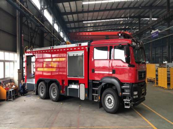 12吨消防车采用中国重汽集团济南卡车股份有限公司 ZZ5356V524MF5 型二类汽车底盘,原装双排驾驶室,乘员2+4人,该车驾乘舒适轻便。上装采用外露式水罐,整车载液量为水12000kg。器材箱采用高质量铝合金卷帘门。底盘取力,发动机型号为MC11.44-60,最大功率327kW,通过万向联轴器驱动安装在汽车尾部泵房里的西安华宇CB10/100型低压消防泵,可在1.0MPa下稳定输出100L/s的流量;车顶安装成都威斯特消防器材有限责任公司生产的PSKD8/80型电动遥控消防炮,流量80L/s,对应压力0.8MPa,最大承压1.3MPa,射程75m,可360°旋转,遥控距离同时该车具有比功率大、综合性能强、操控集中简便等特点。